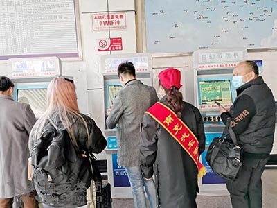 站務(wù)人員引導(dǎo)旅客在售取票機(jī)上購(gòu)取車(chē)票